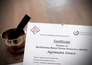 ◊ Nazywam się Agnieszka Oware. Jestem certyfikowanym nauczycielem MBSR z rekomendacją Polskiego Instytutu Mindfulness oraz z dyplomem psychologa Uniwersytetu Warszawskiego.